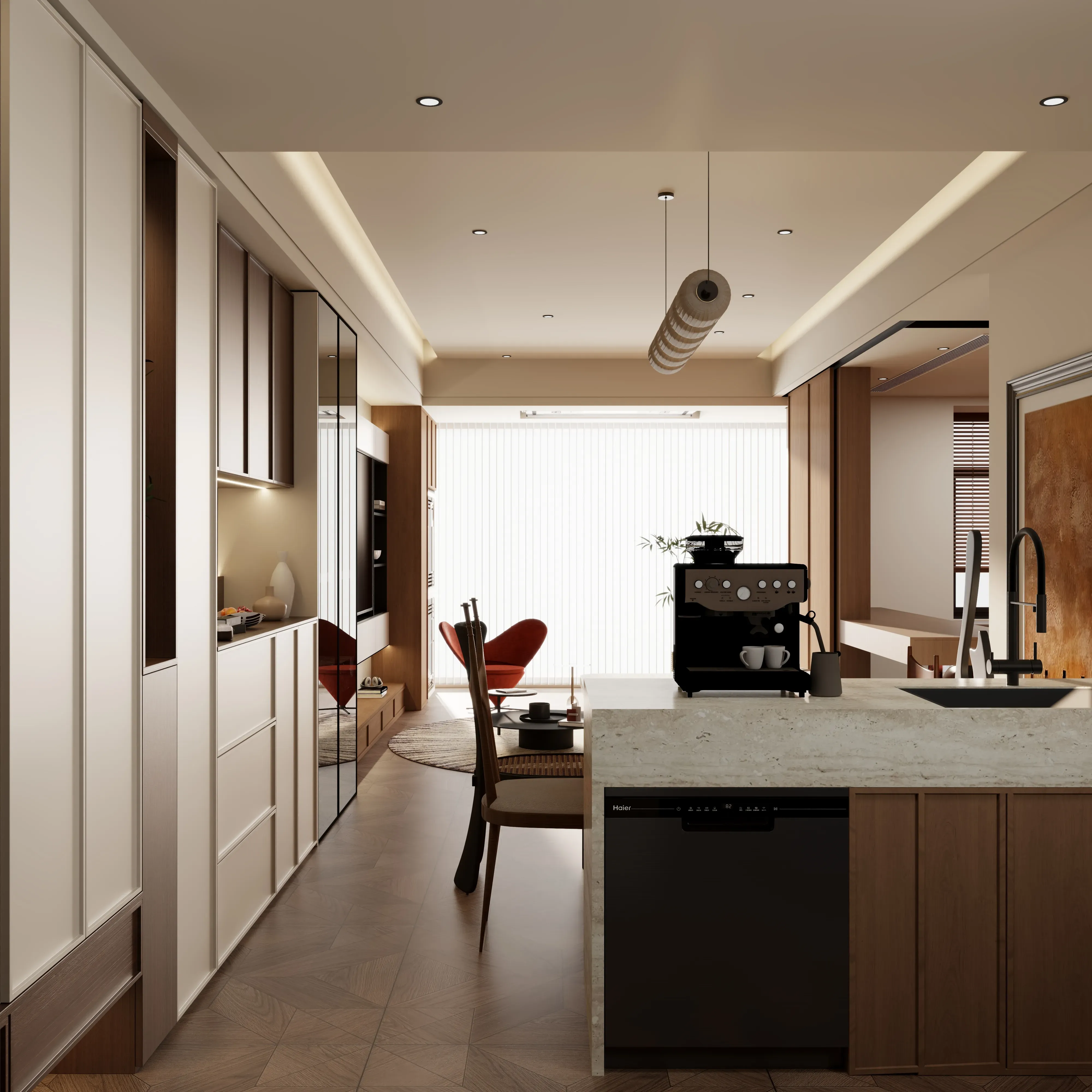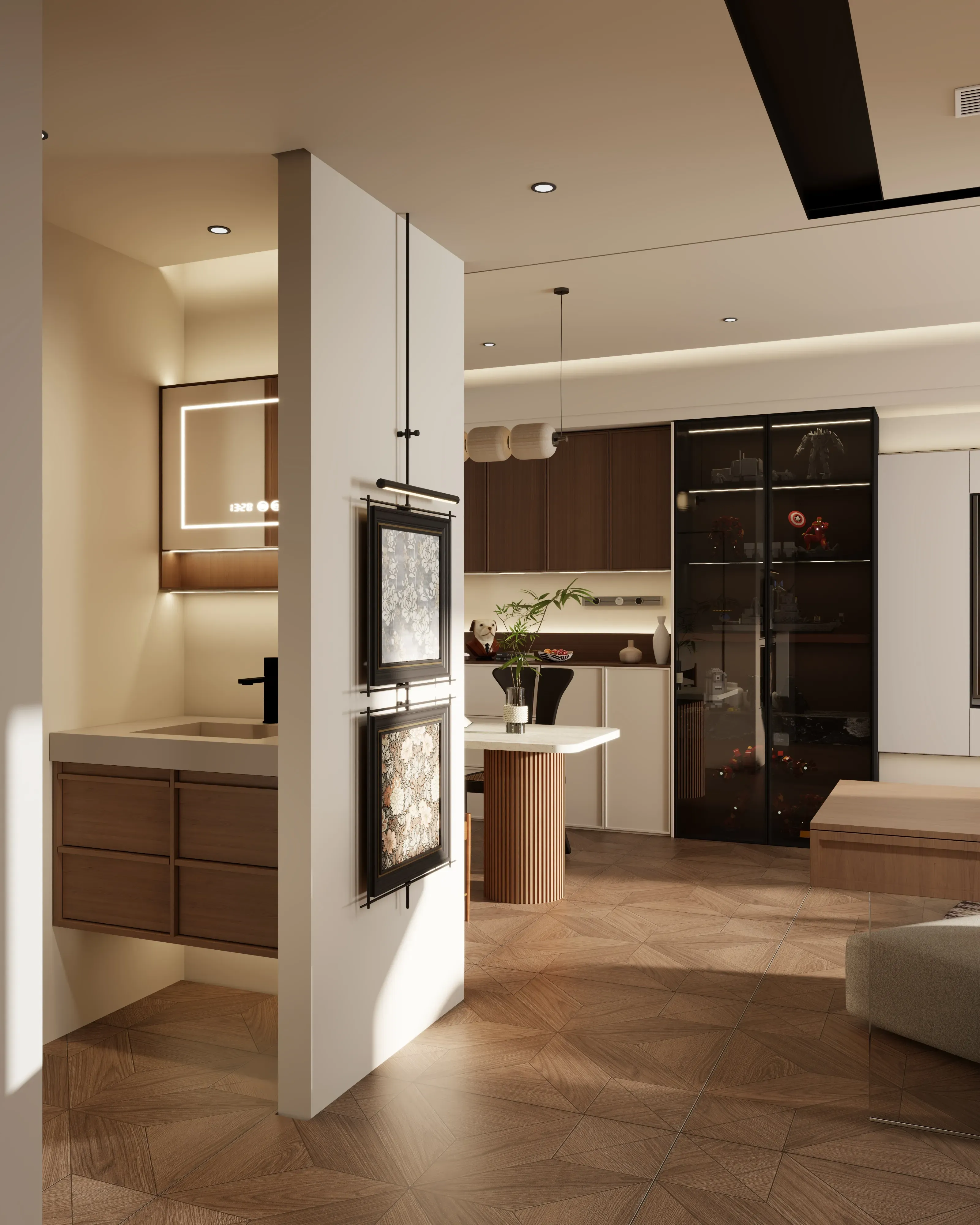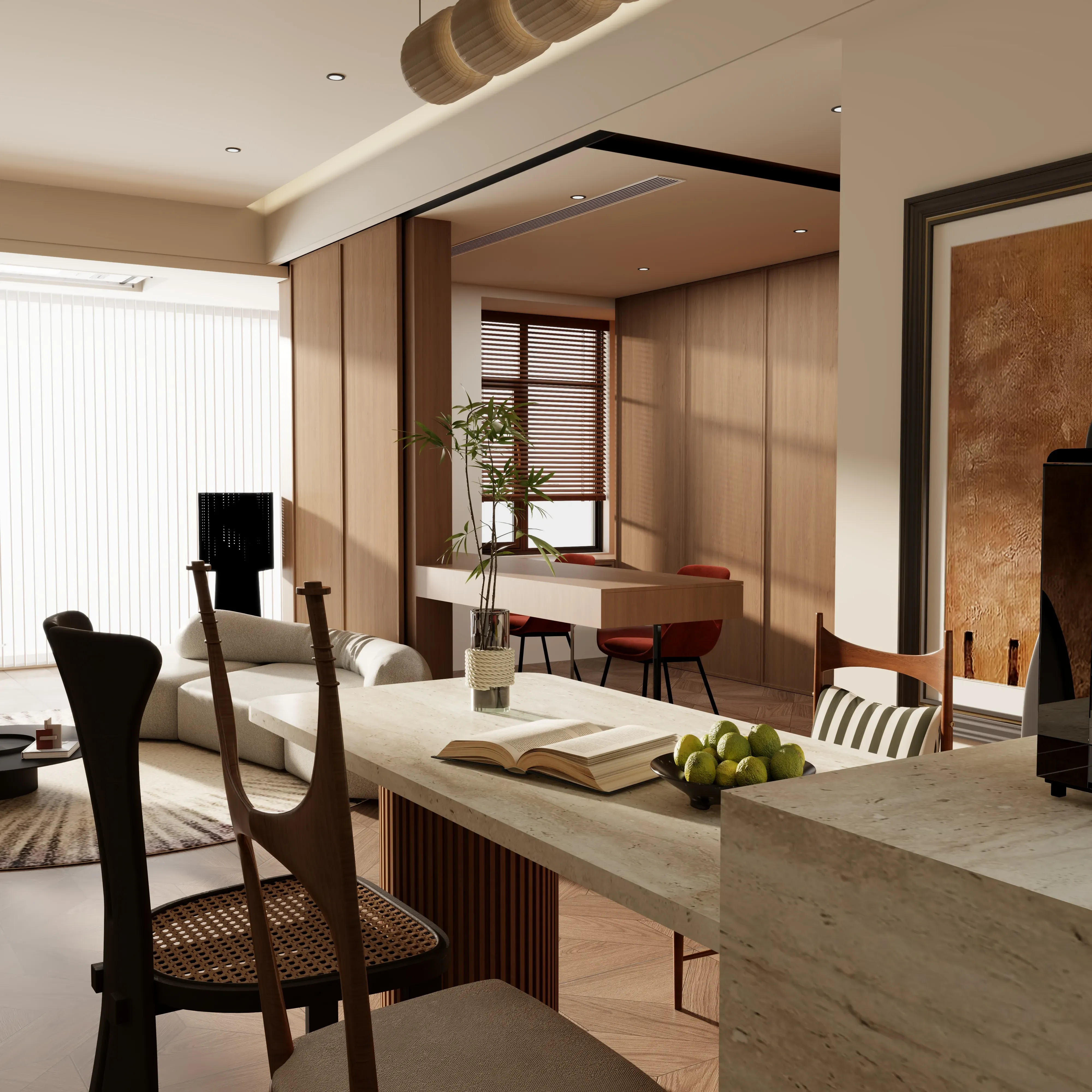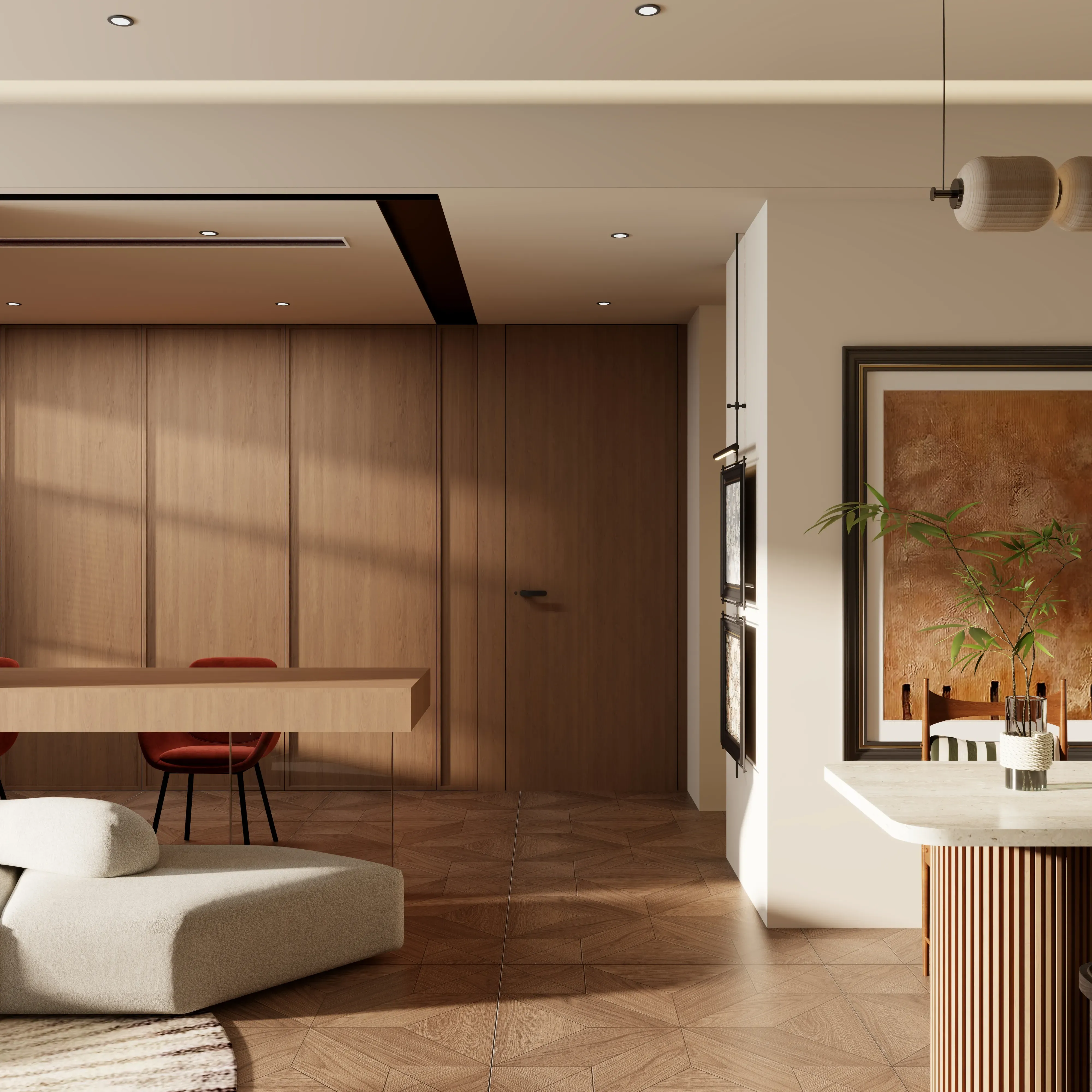 整体格调: 这个空间以 “温润自然主义” 为基调,摒弃了繁复的装饰,强调材质的原始质感和空间的通透性。它像一件柔和的中古现代主义作品,在奶油的温柔与木质的沉稳之间找到了平衡。 地面与底色: 暖木色拼花地板是空间的视觉锚点。无论是人字拼还是鱼骨拼,其纵横交错的纹理为室内增添了复古的秩序感与延伸感。木材的暖调如同被阳光浸润过,从脚底升腾起一种踏实而治愈的温度,奠定了全屋慵懒、亲密的氛围基调。 公区布局: 空间采用半开放式布局,次卧与书房通过可开合的隔断(如玻璃推拉门或镂空书架)与客厅相连。这种设计打破了传统墙体的闭塞,让光线与空气在南北之间自由流淌。当隔断打开时,客厅的视觉纵深被瞬间拉长,形成一个大横厅既视感;关闭时,则各自独立,互不干扰。 核心软装: 客厅中央,白色布艺沙发如同一朵蓬松的云。其哑光、质朴的棉麻质感与拼花地板的精致木纹形成微妙对比,既中和了地面的厚重,又以低饱和度的色彩放大了空间的呼吸感。这里是日常休闲与家庭互动的中心。 餐厨焦点: 开放式厨房的吧台选用天然洞石,表面经过哑光处理,保留了贝壳碎屑和自然孔洞的肌理。这种历经千万年沉淀的石灰岩,与暖木色形成了“刚与柔”、“古与今”的对话。台面上嵌入的咖啡机不仅是功能电器,更是一件陈列品——想象清晨时分,阳光洒在洞石的微孔上,伴随着咖啡油脂萃取的香气,这里是主人唤醒一天的仪式感圣地。 私密休憩: 转入主卧,设计语言回归极致的宁静。延续了客厅的白色布艺床品,像是一座柔软的岛屿。背景墙无需过多装饰,仅借由光影在拼花地板上的流动,营造出一种“一躺即睡”的沉浸式包裹感。 光影与氛围: 全屋采用无主灯设计,以线性灯带和局部定点照明为主。傍晚时分,灯光打在洞石吧台的粗糙表面和拼花地板的细腻漆面上,光影交错间,空间呈现出一种不费力的高级感——既有画廊般的艺术气息,又有“家”独有的那份安心与松弛。