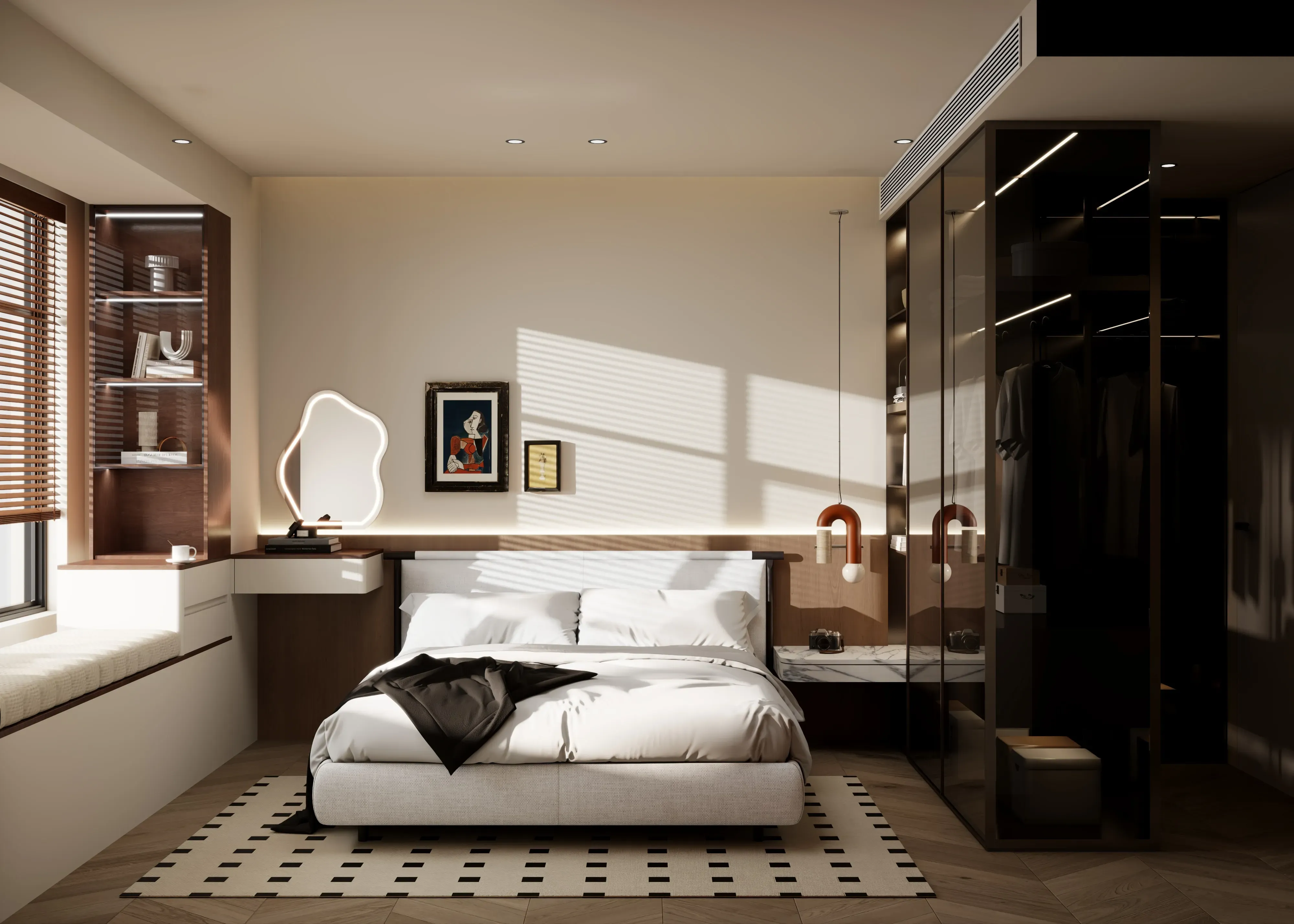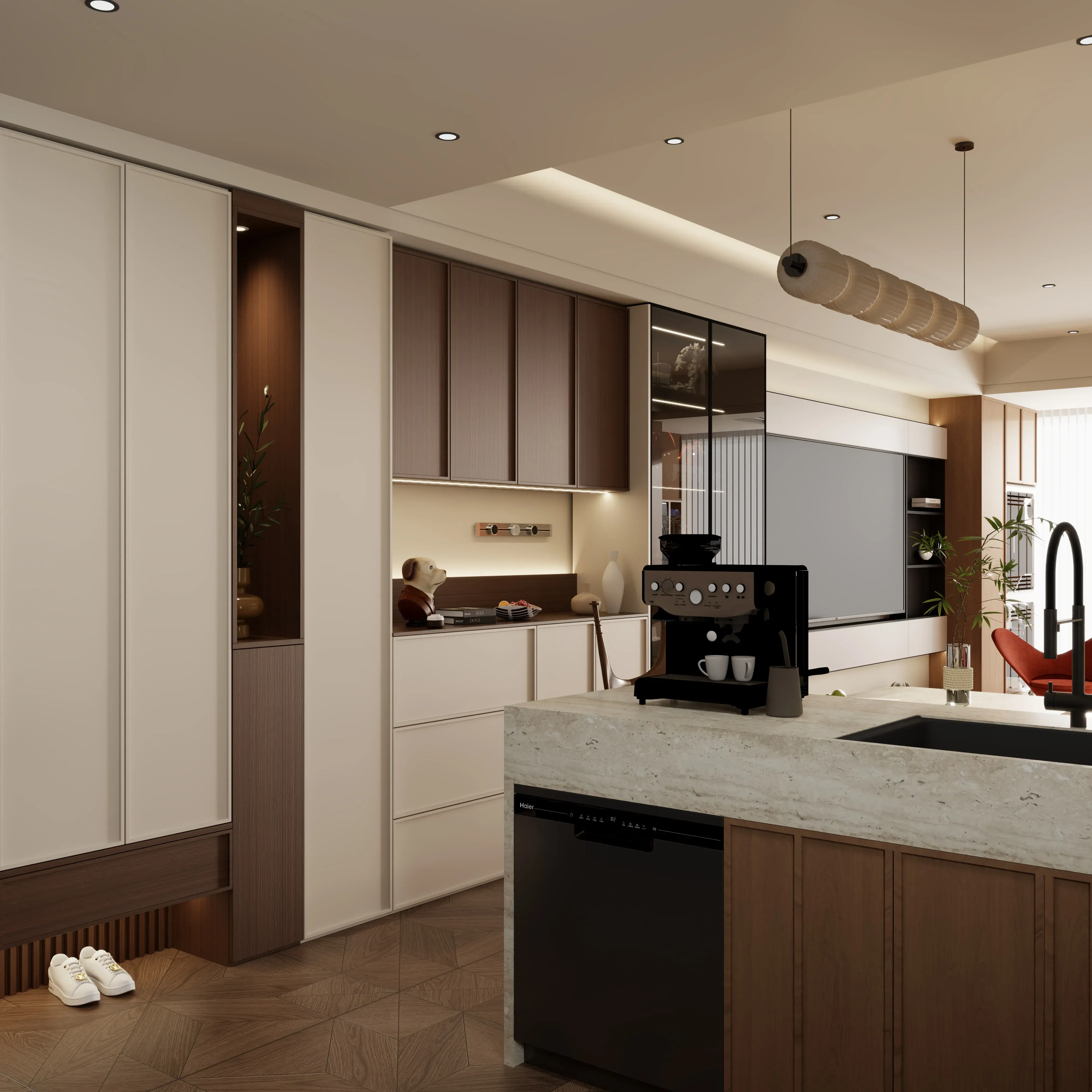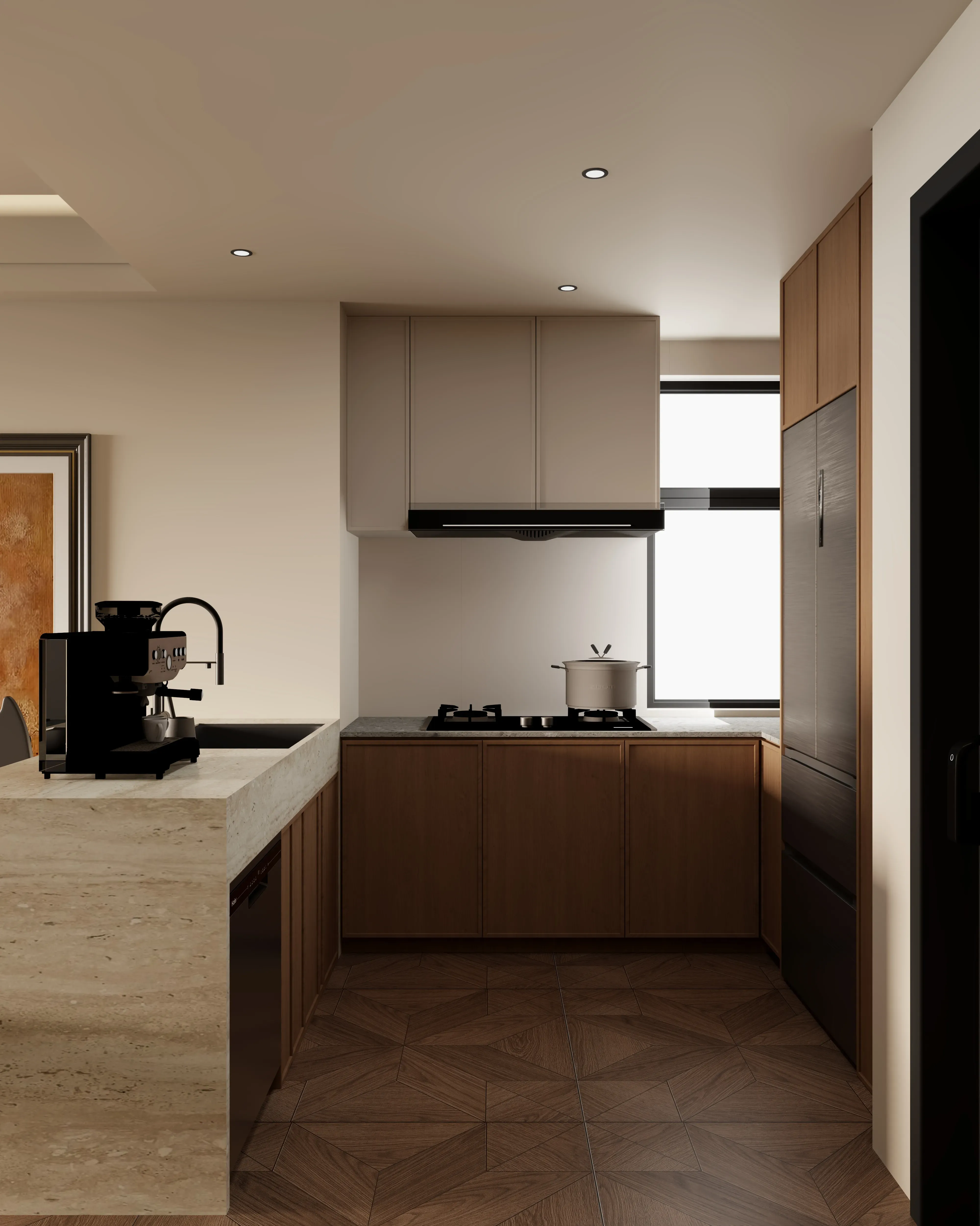 整体格调: 这个空间以 “温润自然主义” 为基调,摒弃了繁复的装饰,强调材质的原始质感和空间的通透性。它像一件柔和的中古现代主义作品,在奶油的温柔与木质的沉稳之间找到了平衡。 地面与底色: 暖木色拼花地板是空间的视觉锚点。无论是人字拼还是鱼骨拼,其纵横交错的纹理为室内增添了复古的秩序感与延伸感。木材的暖调如同被阳光浸润过,从脚底升腾起一种踏实而治愈的温度,奠定了全屋慵懒、亲密的氛围基调。 公区布局: 空间采用半开放式布局,次卧与书房通过可开合的隔断(如玻璃推拉门或镂空书架)与客厅相连。这种设计打破了传统墙体的闭塞,让光线与空气在南北之间自由流淌。当隔断打开时,客厅的视觉纵深被瞬间拉长,形成一个大横厅既视感;关闭时,则各自独立,互不干扰。 核心软装: 客厅中央,白色布艺沙发如同一朵蓬松的云。其哑光、质朴的棉麻质感与拼花地板的精致木纹形成微妙对比,既中和了地面的厚重,又以低饱和度的色彩放大了空间的呼吸感。这里是日常休闲与家庭互动的中心。 餐厨焦点: 开放式厨房的吧台选用天然洞石,表面经过哑光处理,保留了贝壳碎屑和自然孔洞的肌理。这种历经千万年沉淀的石灰岩,与暖木色形成了“刚与柔”、“古与今”的对话。台面上嵌入的咖啡机不仅是功能电器,更是一件陈列品——想象清晨时分,阳光洒在洞石的微孔上,伴随着咖啡油脂萃取的香气,这里是主人唤醒一天的仪式感圣地。 私密休憩: 转入主卧,设计语言回归极致的宁静。延续了客厅的白色布艺床品,像是一座柔软的岛屿。背景墙无需过多装饰,仅借由光影在拼花地板上的流动,营造出一种“一躺即睡”的沉浸式包裹感。 光影与氛围: 全屋采用无主灯设计,以线性灯带和局部定点照明为主。傍晚时分,灯光打在洞石吧台的粗糙表面和拼花地板的细腻漆面上,光影交错间,空间呈现出一种不费力的高级感——既有画廊般的艺术气息,又有“家”独有的那份安心与松弛。
