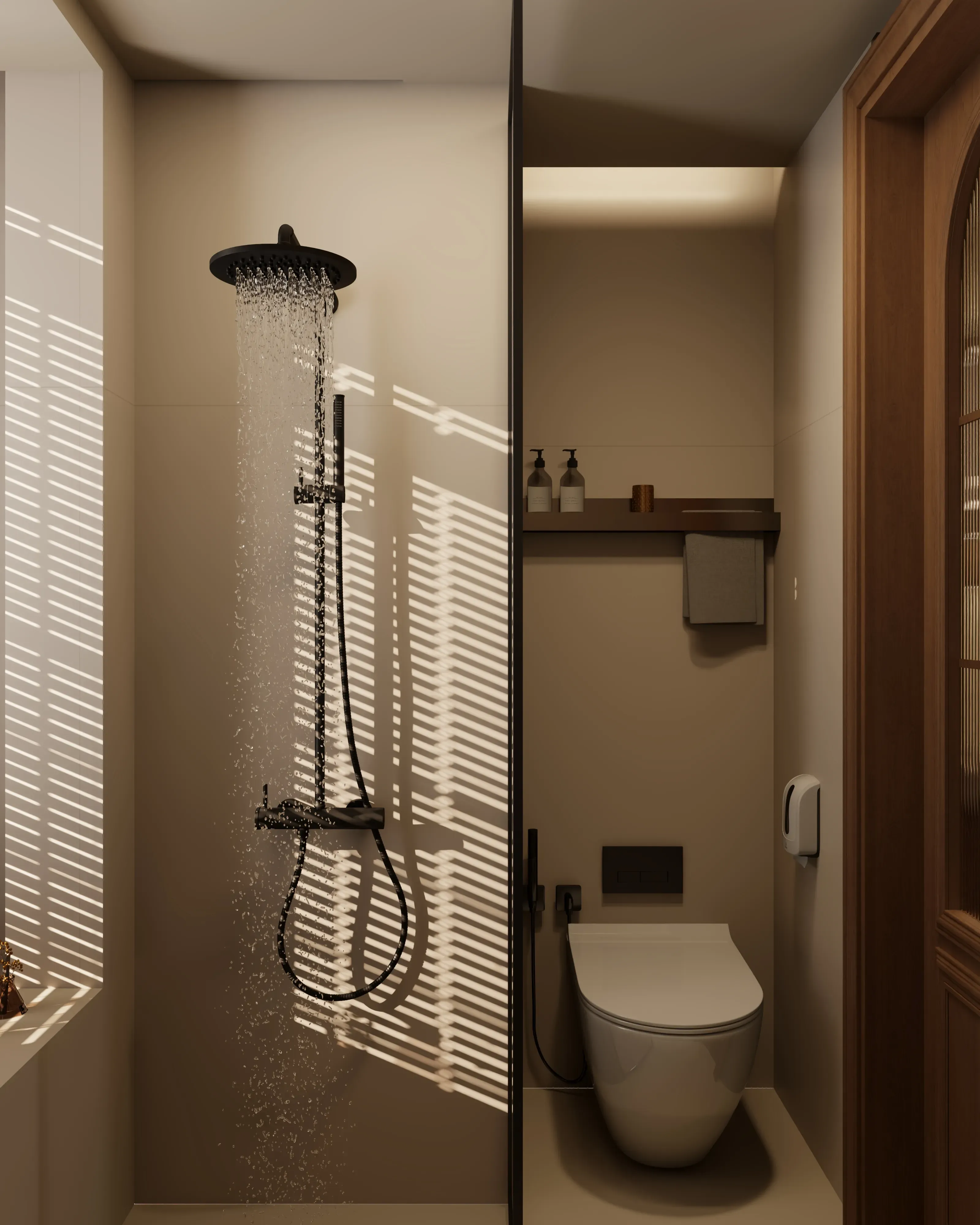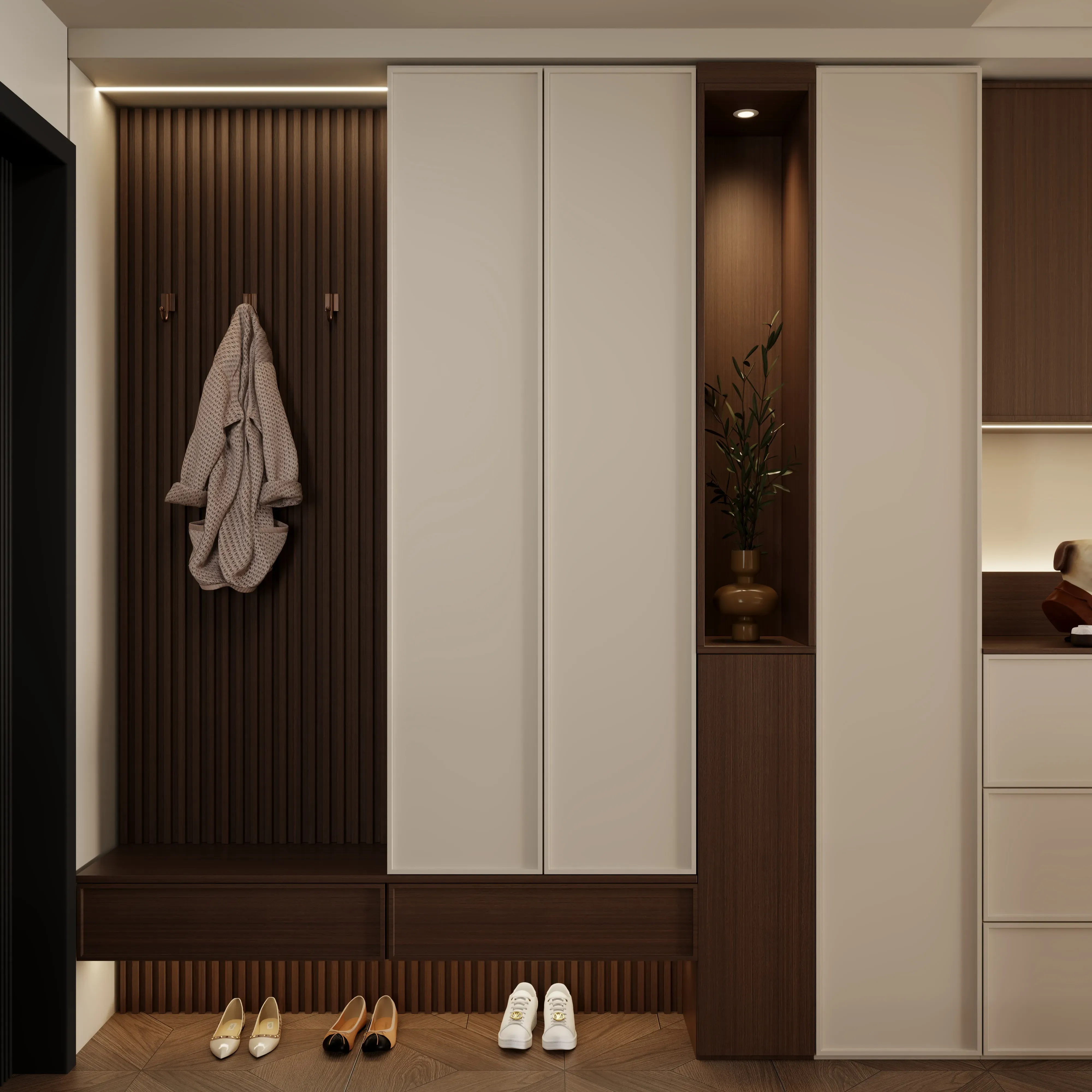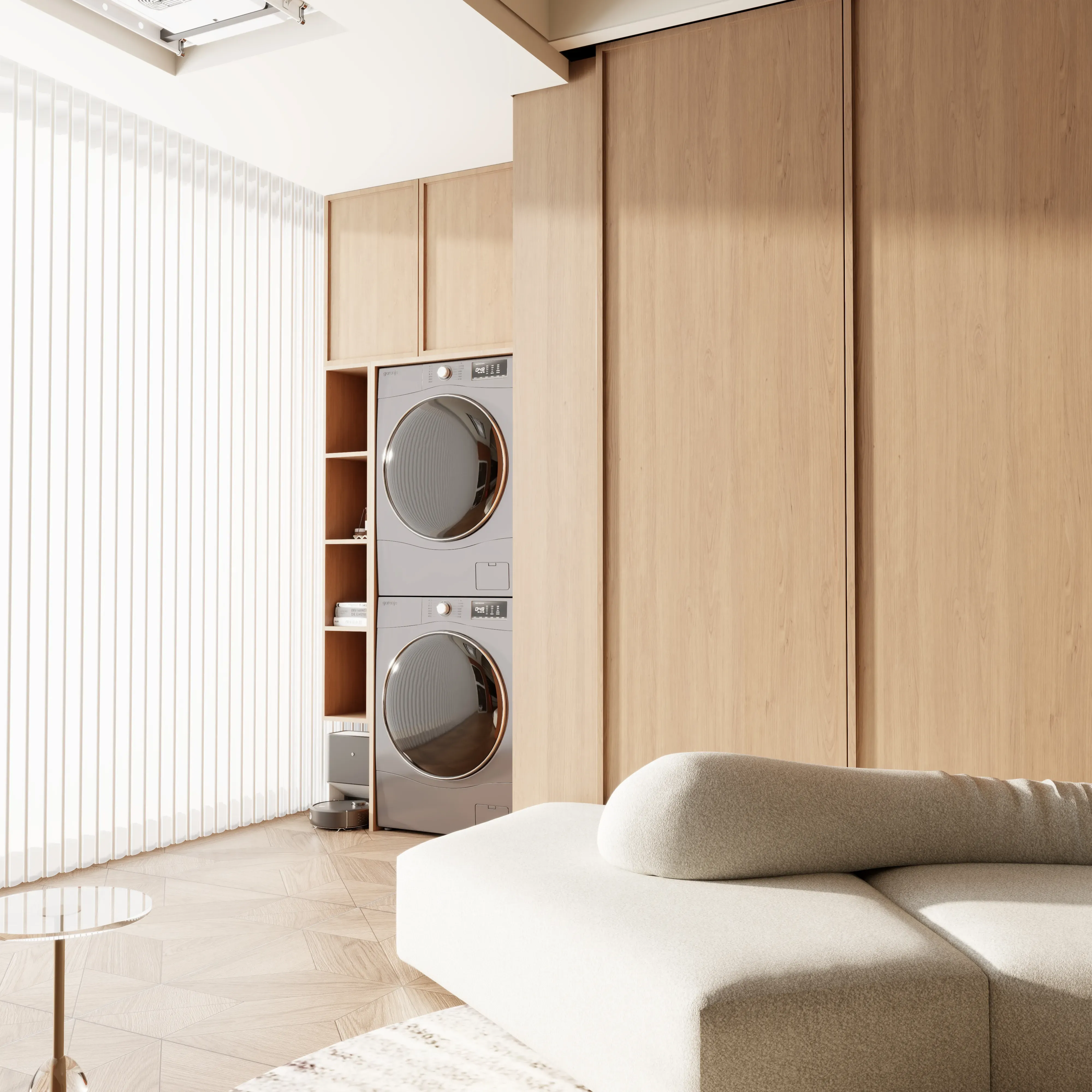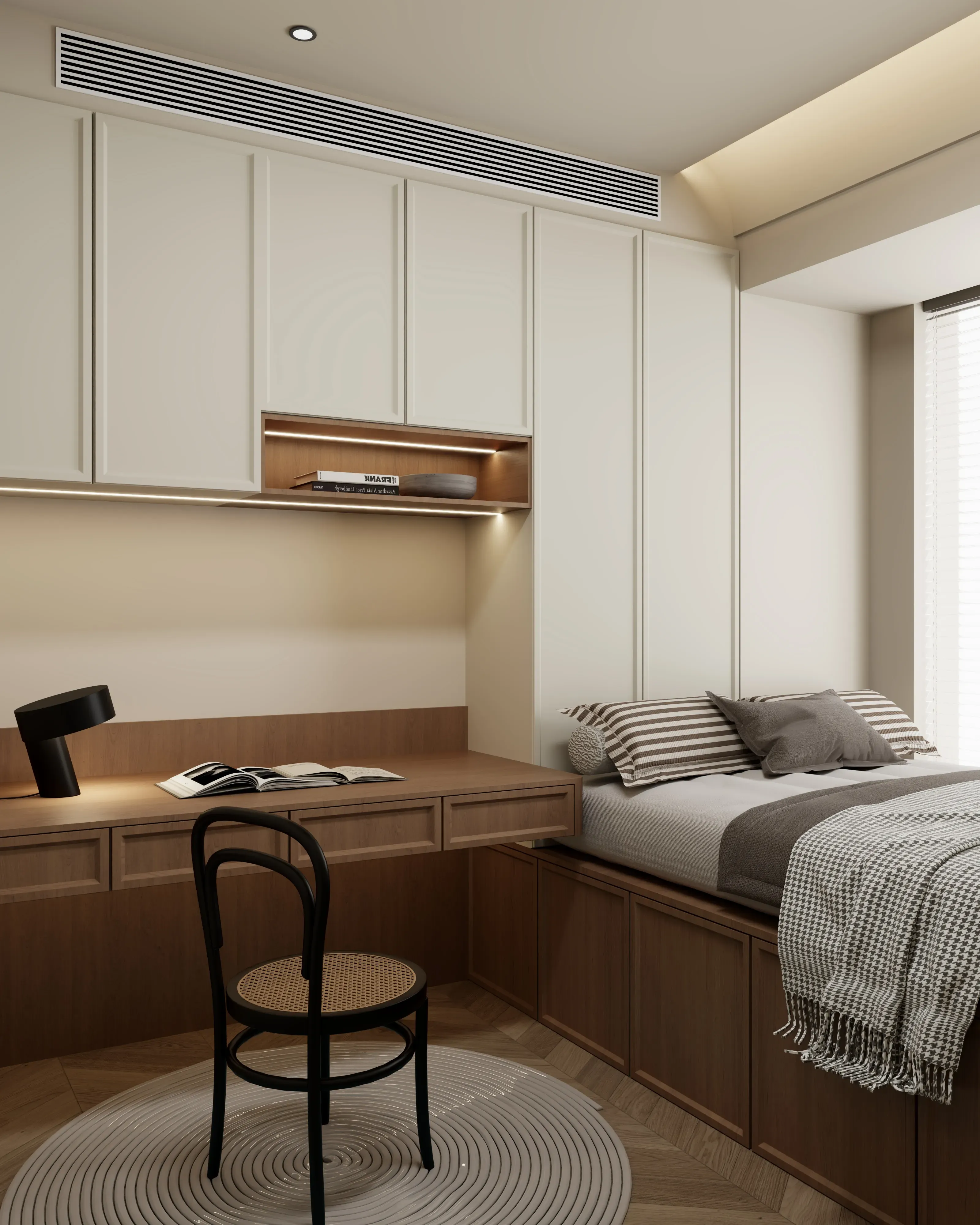 整体格调: 这个空间以 “温润自然主义” 为基调,摒弃了繁复的装饰,强调材质的原始质感和空间的通透性。它像一件柔和的中古现代主义作品,在奶油的温柔与木质的沉稳之间找到了平衡。 地面与底色: 暖木色拼花地板是空间的视觉锚点。无论是人字拼还是鱼骨拼,其纵横交错的纹理为室内增添了复古的秩序感与延伸感。木材的暖调如同被阳光浸润过,从脚底升腾起一种踏实而治愈的温度,奠定了全屋慵懒、亲密的氛围基调。 公区布局: 空间采用半开放式布局,次卧与书房通过可开合的隔断(如玻璃推拉门或镂空书架)与客厅相连。这种设计打破了传统墙体的闭塞,让光线与空气在南北之间自由流淌。当隔断打开时,客厅的视觉纵深被瞬间拉长,形成一个大横厅既视感;关闭时,则各自独立,互不干扰。 核心软装: 客厅中央,白色布艺沙发如同一朵蓬松的云。其哑光、质朴的棉麻质感与拼花地板的精致木纹形成微妙对比,既中和了地面的厚重,又以低饱和度的色彩放大了空间的呼吸感。这里是日常休闲与家庭互动的中心。 餐厨焦点: 开放式厨房的吧台选用天然洞石,表面经过哑光处理,保留了贝壳碎屑和自然孔洞的肌理。这种历经千万年沉淀的石灰岩,与暖木色形成了“刚与柔”、“古与今”的对话。台面上嵌入的咖啡机不仅是功能电器,更是一件陈列品——想象清晨时分,阳光洒在洞石的微孔上,伴随着咖啡油脂萃取的香气,这里是主人唤醒一天的仪式感圣地。 私密休憩: 转入主卧,设计语言回归极致的宁静。延续了客厅的白色布艺床品,像是一座柔软的岛屿。背景墙无需过多装饰,仅借由光影在拼花地板上的流动,营造出一种“一躺即睡”的沉浸式包裹感。 光影与氛围: 全屋采用无主灯设计,以线性灯带和局部定点照明为主。傍晚时分,灯光打在洞石吧台的粗糙表面和拼花地板的细腻漆面上,光影交错间,空间呈现出一种不费力的高级感——既有画廊般的艺术气息,又有“家”独有的那份安心与松弛。