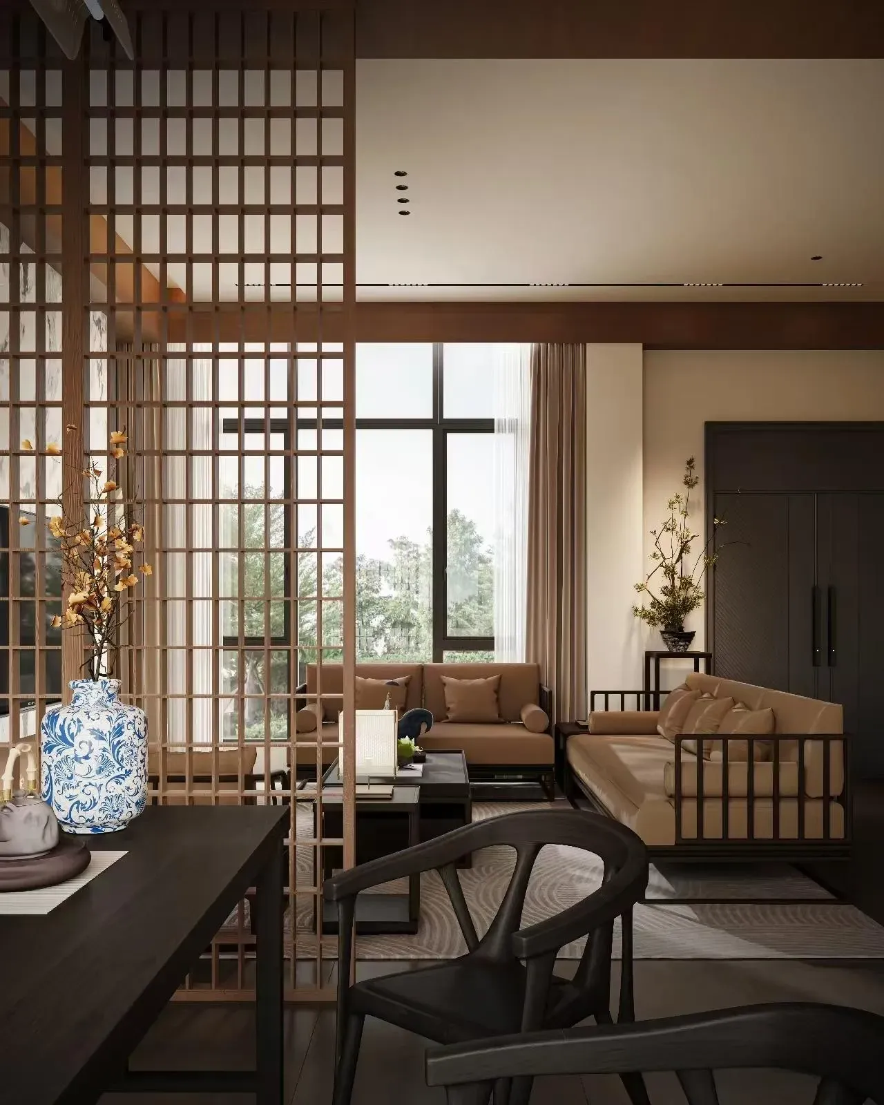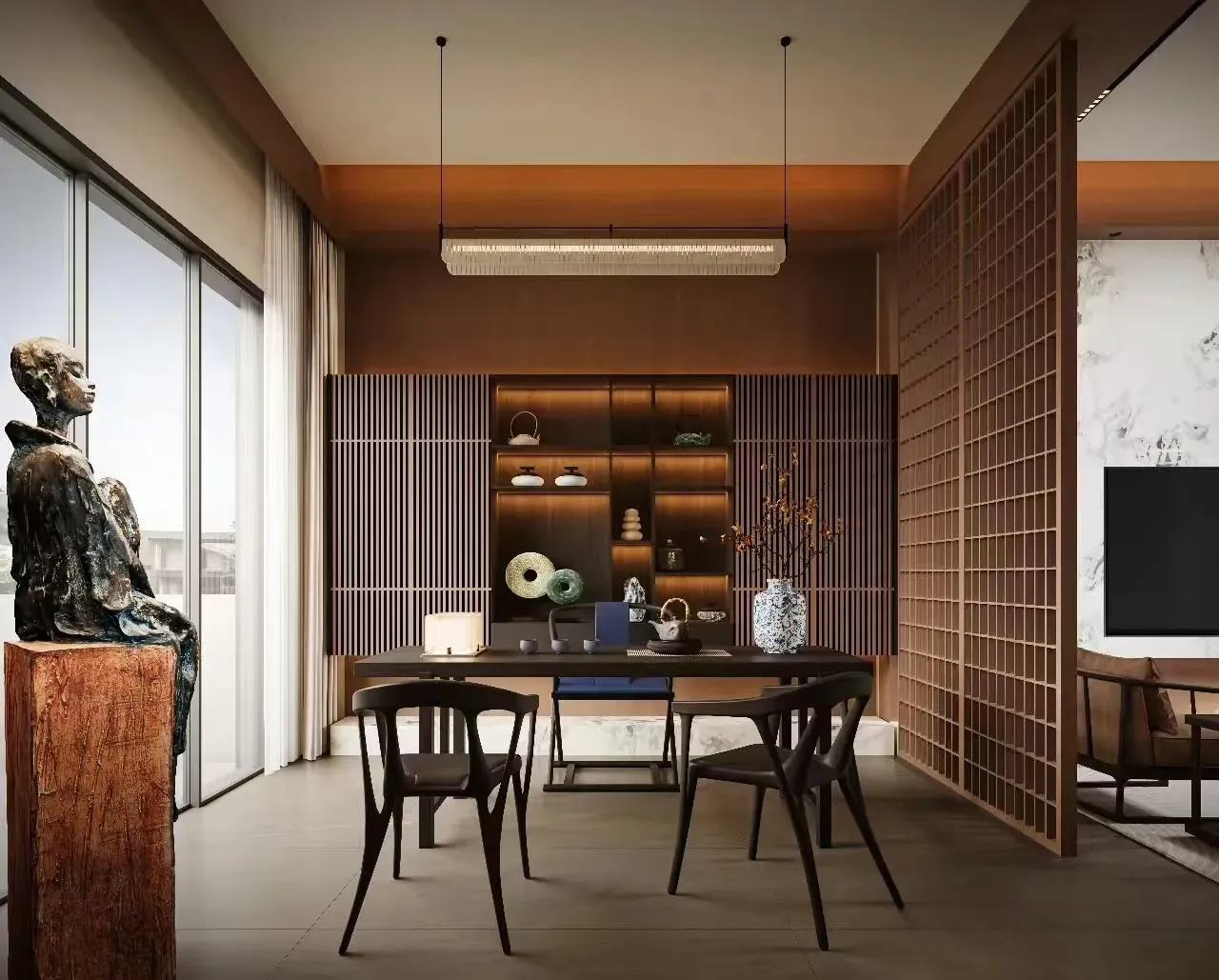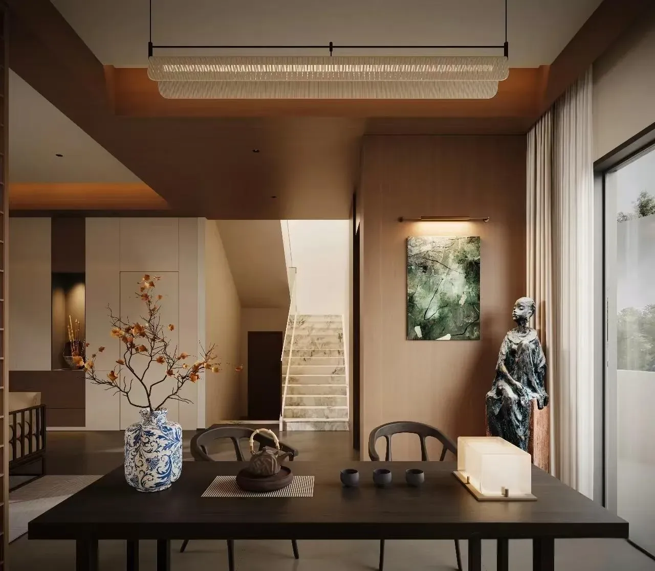 宋韵今筑|浅木留白的东方呼吸 这座别墅以宋人「格物致知」为精神底本,让浅胡桃木色如淡墨般晕染空间。改良宋式梁架抽离繁复雕饰,仅以精炼线条勾画屋顶轮廓;定制现代中式家具摒弃厚重体量,采用纤巧燕尾榫与悬浮设计,似古画中飘出的器具。 素白搭配木饰墙面成为最佳展卷——青瓷梅瓶于壁龛内独映天光,古木青铜雕塑在转角处凝驻云气。餐厅麻质卷帘半垂,将庭院竹影筛成活的《墨竹图》;书房透光云石板案几上,一尊残缺陶俑与现代世界构成时空对谈。