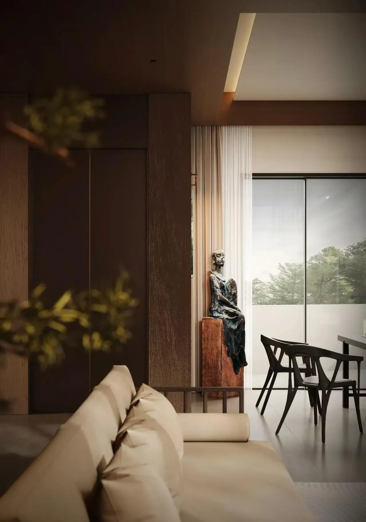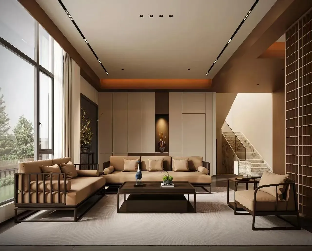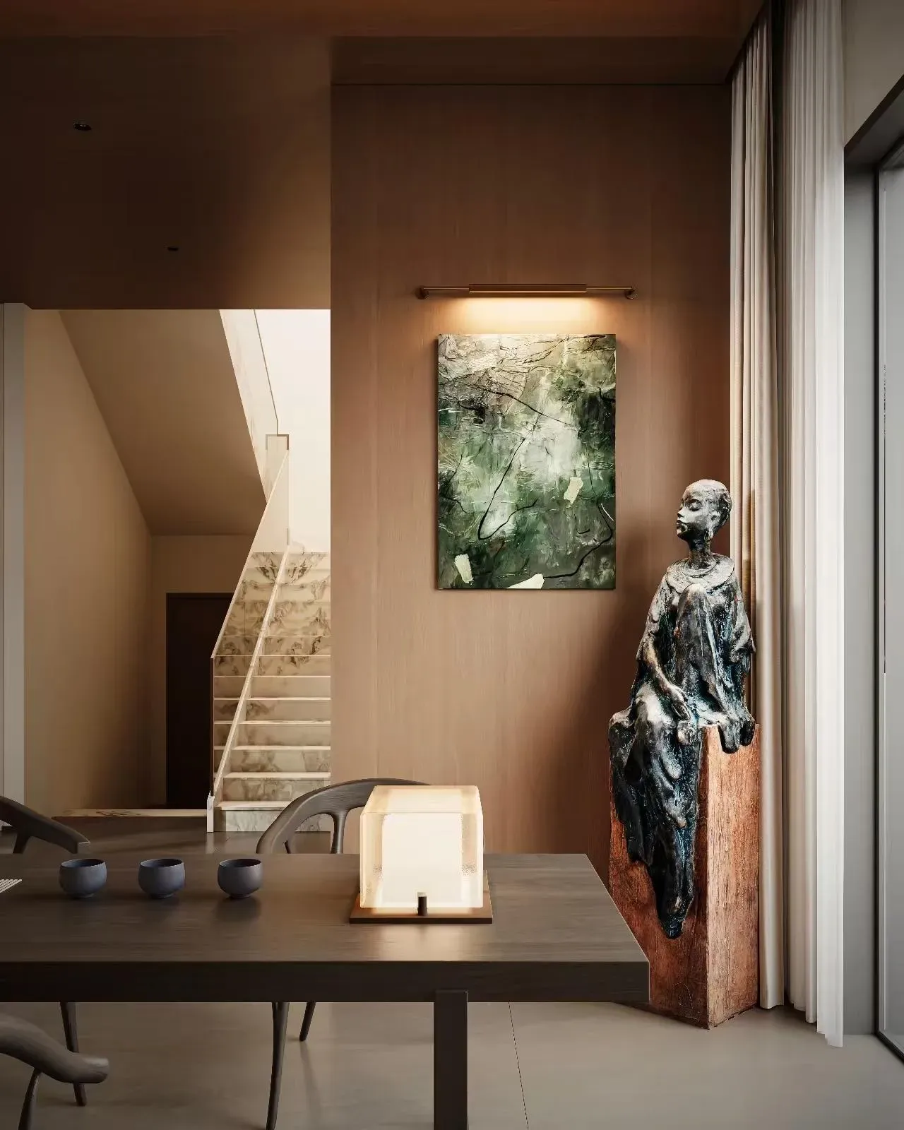 宋韵今筑|浅木留白的东方呼吸 这座别墅以宋人「格物致知」为精神底本,让浅胡桃木色如淡墨般晕染空间。改良宋式梁架抽离繁复雕饰,仅以精炼线条勾画屋顶轮廓;定制现代中式家具摒弃厚重体量,采用纤巧燕尾榫与悬浮设计,似古画中飘出的器具。 素白搭配木饰墙面成为最佳展卷——青瓷梅瓶于壁龛内独映天光,古木青铜雕塑在转角处凝驻云气。餐厅麻质卷帘半垂,将庭院竹影筛成活的《墨竹图》;书房透光云石板案几上,一尊残缺陶俑与现代世界构成时空对谈。